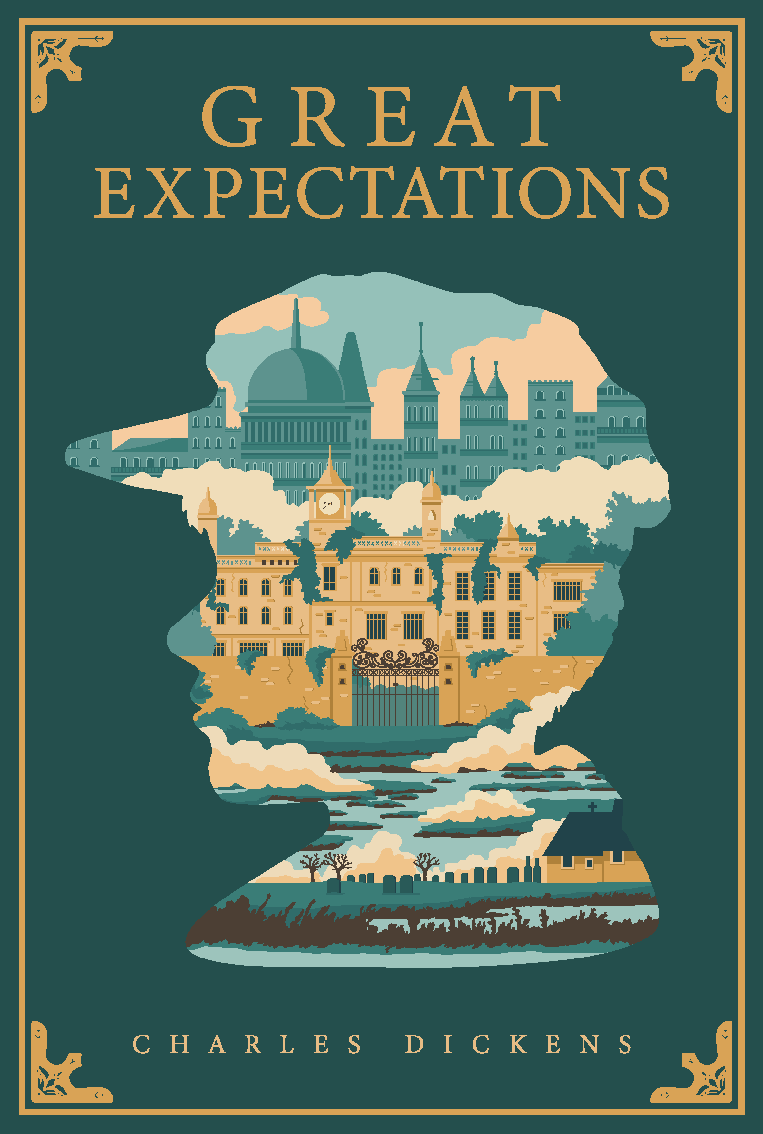 In 2019, after reading Great Expectations by Charles Dickens, I was inspired to create my own version of a book cover. I used Adobe Illustrator to create the intricate graphics inside of Pip’s silhouette, which present all the different locations where the story takes place, as each one stands for important phases in the protagonist’s life.